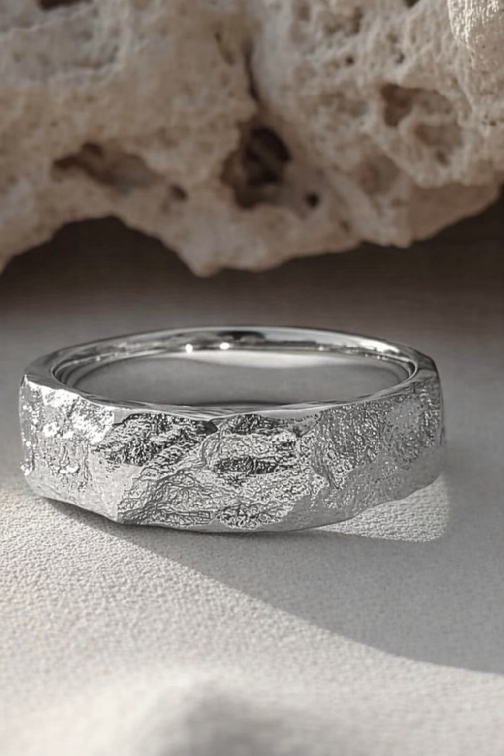 Bold yet timeless — this wide band ring is crafted from pure silver and plated in gold, featuring an engraved textured surface that adds a raw, organic edge to its elegant presence.”