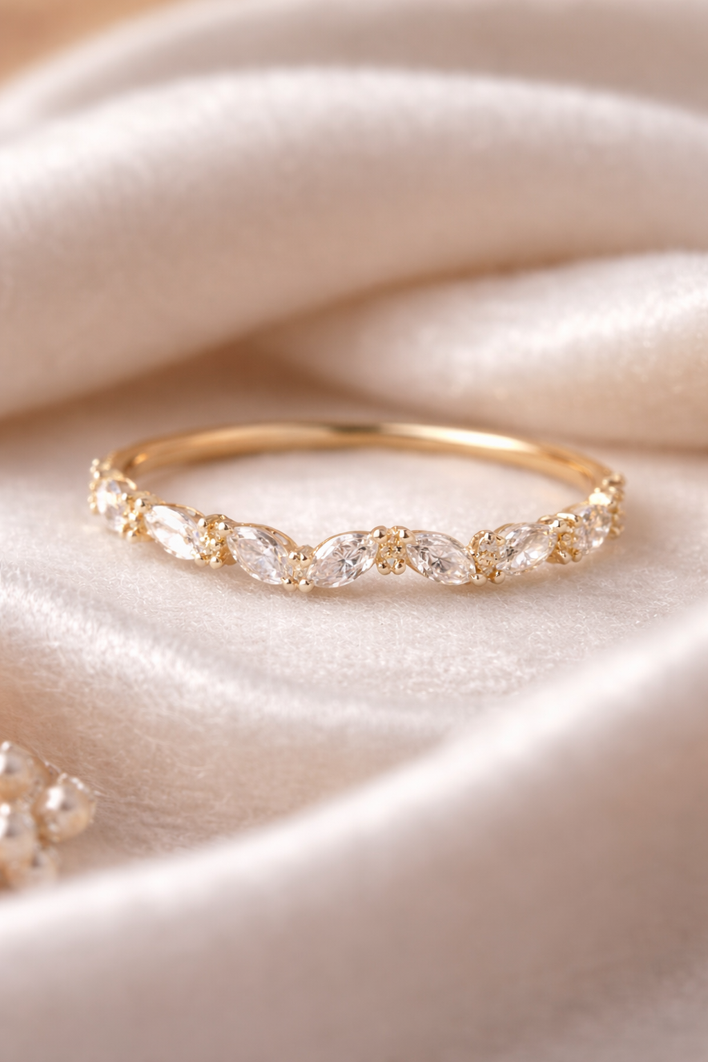 A delicate and elegant band designed to add a touch of timeless sparkle. Featuring a graceful sequence of marquise and round-cut stones, this ring creates a refined floral-inspired pattern that shines beautifully with every movement.