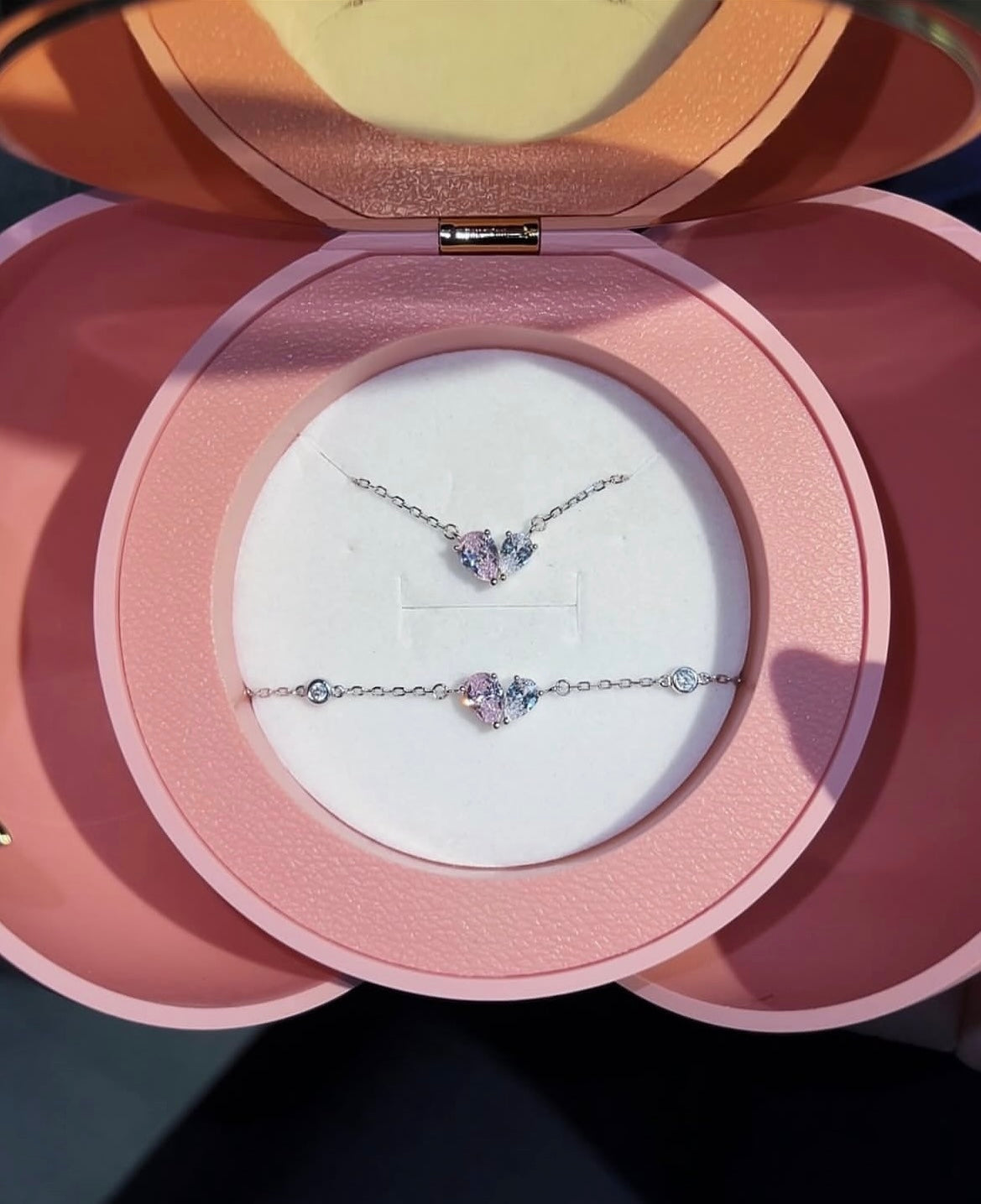 - Necklace: Simple sterling silver chain with a central heart-shaped element made of two contrasting zircon halves (rose & clear). Adjustable length.